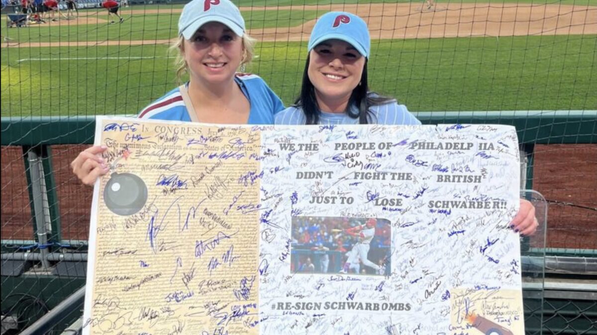 Two Phillies fans from Pottsville, Schuylkill County, Rebecca Hummel and McKenzie Buehner, tried a more creative approach to petition the Phillies to re-up the beloved basher who has hit 176 home runs since he signed with the Phillies prior to the 2022 season—many of them majestic moonshots that seem like they might never land.