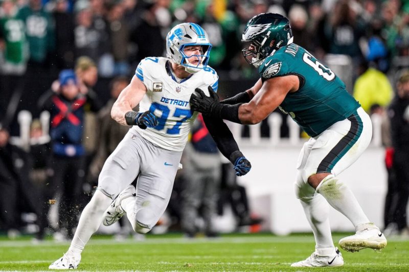 Detroit Lions defensive end Aidan Hutchinson (97) pressures Philadelphia Eagles offensive tackle Jordan Mailata (68) during the first half at Lincoln Financial Field in Philadelphia on Sunday, November 16, 2025.