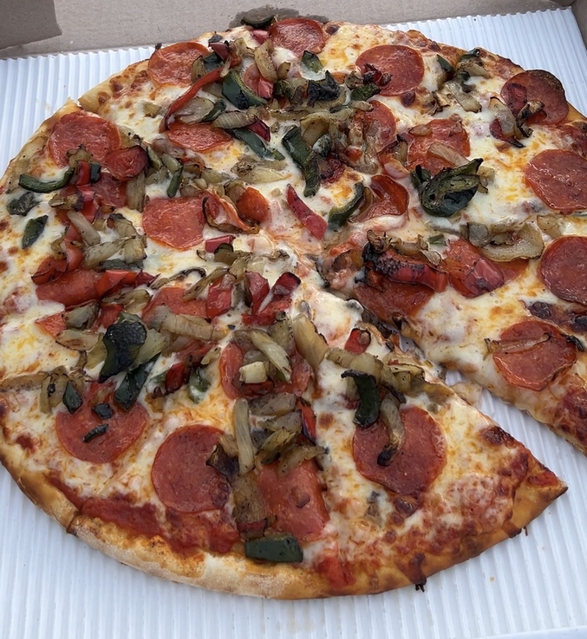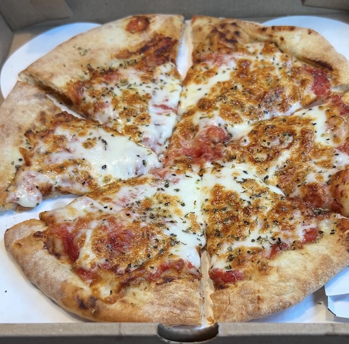 Spoiler alert: Wawa wins this battle. And while it was a very low bar to clear, Wawa’s pizza doesn’t look or taste like a pizza that’s been made at an establishment where you can also put air in your tires and purchase both loose bananas and condoms. So there’s that. They keep things simple. Wawa’s pies are available in 14” and 16” varieties, along with a personal size, and they offer just a few options for toppings: pepperoni, sausage, and peppers and onions. (They also offer teriyaki as a dipping sauce option—the less said about that, the better). To look at the pie, you’d think it came from an actual pizzeria. It’s got a little char on the top and bottom, and the crust is firm while foldable. To taste it, you’d also think it came from an actual pizzeria—just maybe not one of the better ones in your town. I got a large with pepperoni and peppers and onions ($16.99) and found it to be entirely satisfactory. It really wasn’t all that bad, with a creamy cheese blend, sweet-ish sauce, and a flavorful crust. Though Wawa doesn’t start serving its pizza until 4 p.m., most locations serve it up until 3 a.m. And you’d be hard-pressed to find a pie of this quality at that hour. Rating: Better than you’d think, but hardly great.