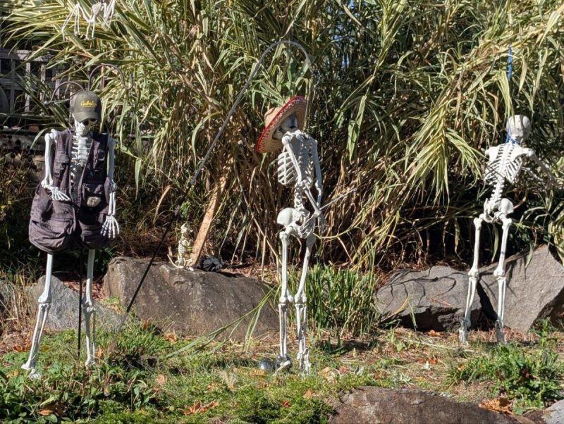 A resident put a skeleton in a sombrero with its wrists ziptied in the front yard. A second skeleton beside it wears a baseball cap and a black utility vest that resembles garb worn by agents of U.S. Immigration and Customs Enforcement, aka ICE.