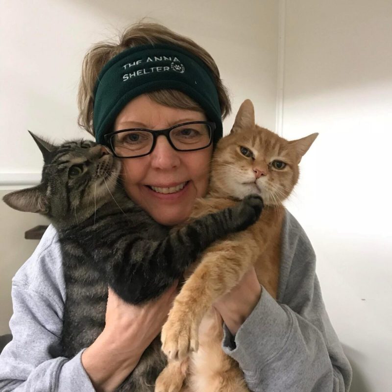 She orientates new volunteers, assists with cleaning, meets with potential adopters, runs donations, does intake at their pet food bank and spends time in the cat room.