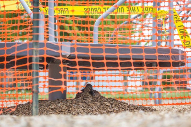 “Well, mama duck has decided that the mulch under the merry-go-round is a perfectly comfy place to nest,” the department said in a social media post.