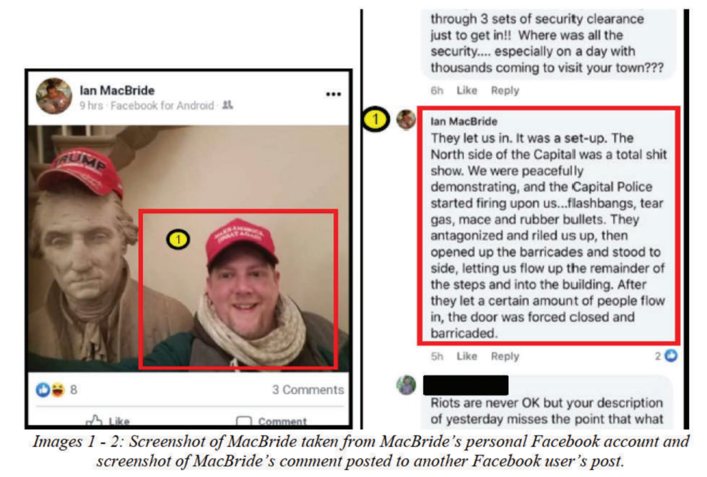 McBride was arrested last January and charged with a felony offense of obstruction of an official proceeding, along with several misdemeanor offenses. According to court documents, MacBride, 43, entered the building through the Senate wing door just five minutes after the initial breach and stole a U.S. Capitol Police sign that said “area closed.” He later posted on a social media forum, stating, “Hung my Capitol battle flags and ill gotten ‘Area Closed’ sign up in my bar tonight.” In the days following the events of Jan. 6, MacBride posted on a social media forum that, “I don’t regret my part in occupying the building.”