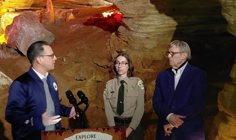 “It’s a great day for the Commonwealth of Pennsylvania,” he said. “It’s a legacy conservation donation by David and Lillian Cale. In addition to that conservation legacy donation of the entire property including the cavern, we’re starting a new public-private partnership with David and Lillian Cale and they will continue on with cave operations in the future,” Hallas said. “It’s a momentous day.