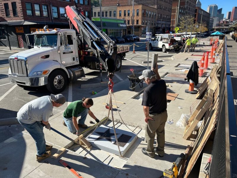 Workers installing one of the first 10 plaques for the Pittsburgh Walk of Fame in the city's Strip District.