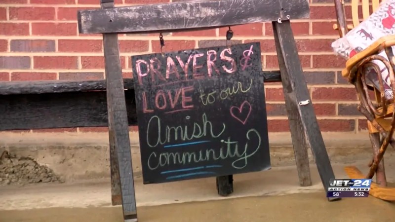 This image taken from video shows a sign displayed at a local business in Spartansburg, Pa., Feb. 27, 2024. Investigators have no suspects in the killing of a pregnant 23-year-old Amish woman inside her home in rural northwestern Pennsylvania, and are appealing for tips from the public to help solve the crime, a state police spokeswoman said Wednesday. (Craig Rouse/WJET via AP)