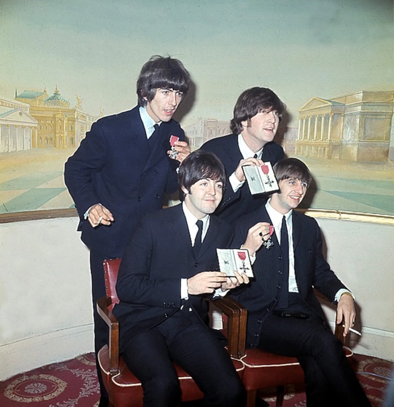 FILE – The Beatles, standing from left George Harrison and John Lennon; seated, Paul McCartney, left, and Ringo Starr display their MBE medals during a news conference in London, England, Oct. 26, 1965. They were made members of the Order of the British Empire by the Queen of England at Buckingham Palace. The queen inevitably became the subject of many a pop song. The Beatles immortalized the queen with the tongue-in-cheek “Her Majesty,” calling her “a pretty nice girl” though “she doesn’t have a lot to say.” The brief song, sung by Paul McCartney and recorded in 1969, appeared at the end of the album “Abbey Road.” (AP Photo, File)
