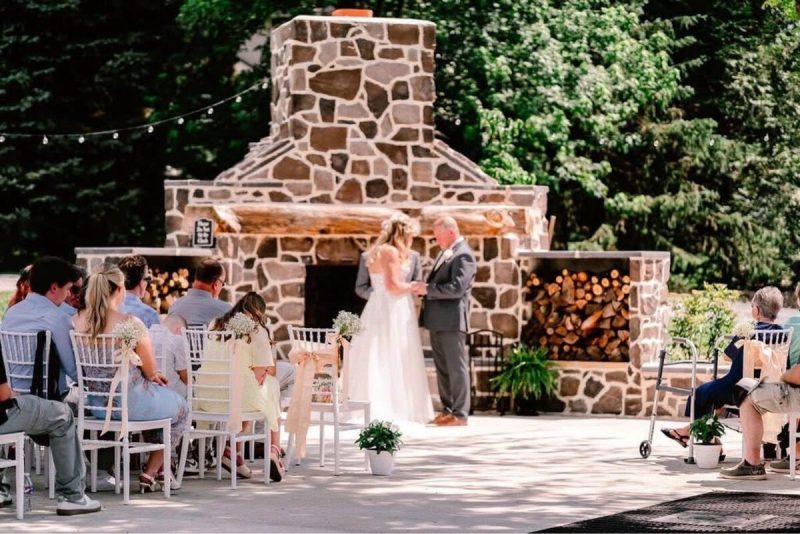 Each couple’s hourlong elopement booking will include a 15-minute ceremony, which they can do in the barnyard in front of a “really old, really pretty” stone fence,” or on a stone patio in front of a fireplace, which is one of the venue’s most popular ceremony spots, Dunn said. A couple can invite up to four guests.