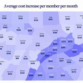 In Pennsylvania, according Pennie, premiums jumped on average 102 percent. The average premium increase in York County, according to Pennie, was 169 percent. The highest average was recorded in Juniata County, at 485 percent. The lowest, Sullivan County, with a population of fewer than 6,000 in the northeast corner of the state was 29 percent.