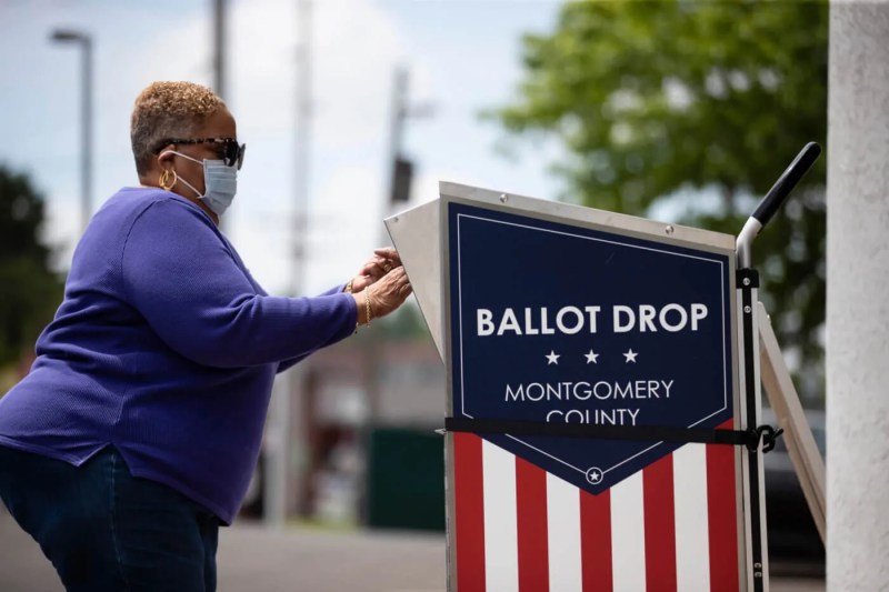 A voter drops off their mail-in ballot prior to the primary election, in Willow Grove, Pa., Wednesday, May 27, 2020. (AP Photo/Matt Rourke)