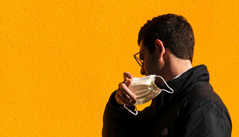 A pedestrian removes a protective mask worn as a precaution against the spread of the coronavirus in Philadelphia, Wednesday, March 2, 2022. (AP Photo/Matt Rourke)