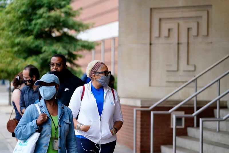 Residents wait in line outside a satellite election office at Temple University's Liacouras Center, Tuesday, Sept. 29, 2020, in Philadelphia. (AP Photo/Matt Slocum)