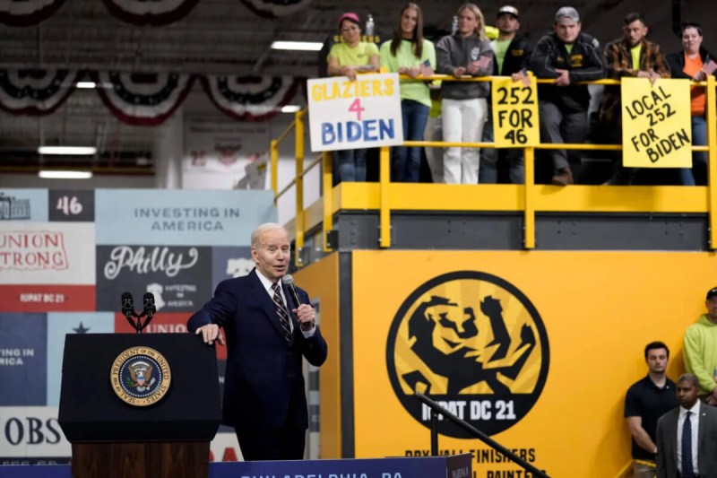 President Joe Biden speaks about his 2024 proposed budget at the Finishing Trades Institute, Thursday, March 9, 2023, in Philadelphia. (AP Photo/Matt Rourke)