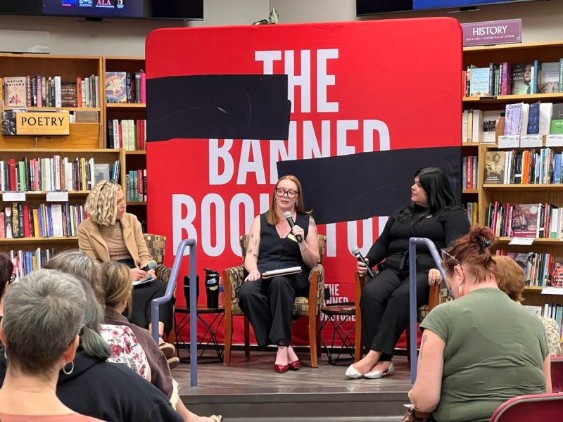 From left: Erin MacFarlane of Arizona Library Association, Katelynn Contreras of ACLU of Arizona, and Beth Lewis of Save our Schools speak on a panel against efforts to limit book access in Arizona.