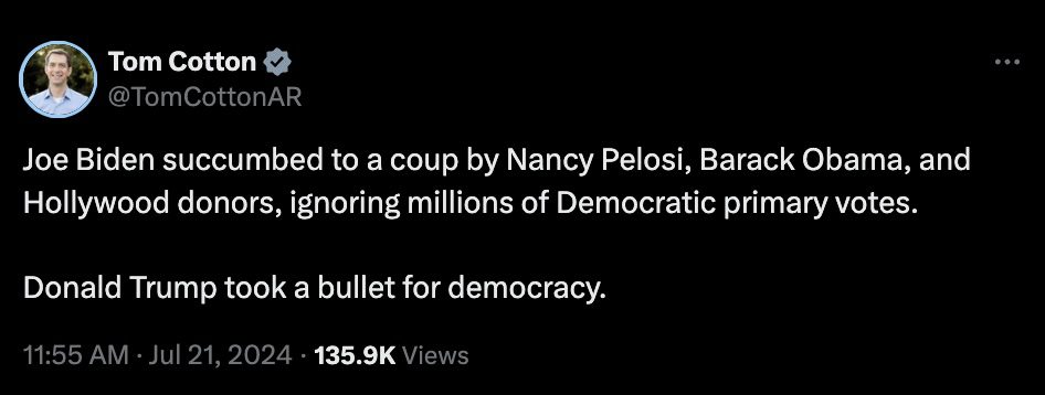 Other Republicans also embraced that rhetoric, with Sen. Tom Cotton of Arkansas calling Biden’s decision to step aside a “coup by Nancy Pelosi, Barack Obama, and Hollywood donors.”