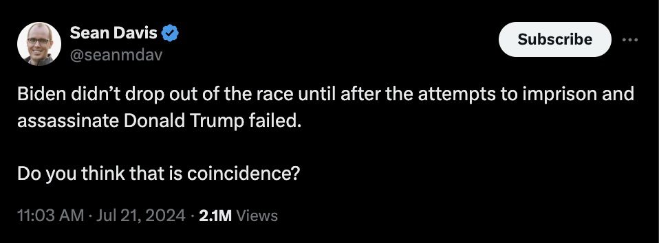 “Biden didn’t drop out of the race until after the attempts to imprison and assassinate Donald Trump failed. Do you think that is coincidence?” said Sean Davis, CEO and co-founder of The Federalist, a right wing media outlet.