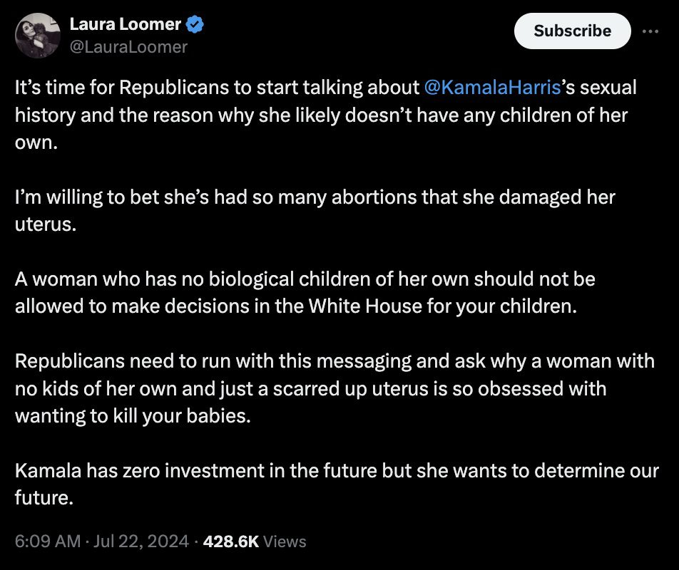 “It’s time for Republicans to start talking about @KamalaHarris’s sexual history and the reason why she likely doesn’t have any children of her own,” Loomer said. “A woman who has no biological children of her own should not be allowed to make decisions in the White House for your children.”