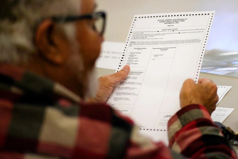 A poll worker holds a ballot at the Trinity Christian Fellowship Hall polling place in Biglerville, Pa., Tuesday, Nov. 8, 2022. (AP Photo/Carolyn Kaster)