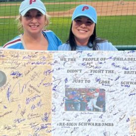 Rebecca Hummel and McKenzie Buehner of Pottsville petitioned the Phillies to re-sign slugger Kyler Schwarber with a poster that garnered hundreds of signatures and read “We the people of Philadelphia didn’t fight the British just to lose Schwarber!!”