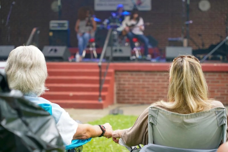 Joyce Massucci, right, holds hands with her friend "Smiling Dave" as they listen to "Soulful Femme" on the first day of the Franklin Blues & Barbecue Festival, Saturday, June 19, in Franklin, Pa. The annual festival with free music, returned after being canceled last year due to COVID-19, uses proceeds from vendors and sponsors to support the music programs in the local public schools. The festival helped celebrate the first Juneteenth celebration in the city.(AP Photo/Keith Srakocic)
