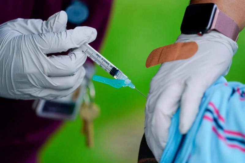 A health worker administers a dose of a Pfizer COVID-19 vaccine during a vaccination clinic at the Reading Area Community College in Reading, Tuesday, Sept. 14, 2021. (AP Photo/Matt Rourke)