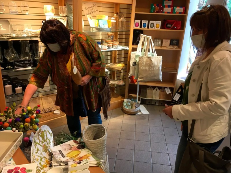 Friends Michele Boone, left, and Michele Blasius said they were enjoying “the freedom of shopping” on Friday, May 8, 2020, at a gift ship in downtown Lewisburg, Pa. (AP Photo/Mark Scolforo)