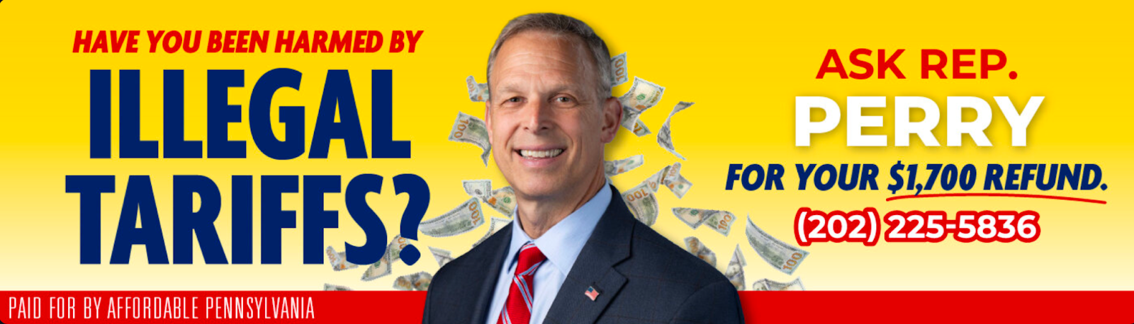The organization launched a billboard campaign in US House Reps. Rob Bresnahan’s (R-Luzerne), Ryan Mackenzie’s (R-Lehigh) and Scott Perry’s (R-York) congressional districts to encourage constituents to call their representatives and demand refunds from the president’s unlawful tariffs.