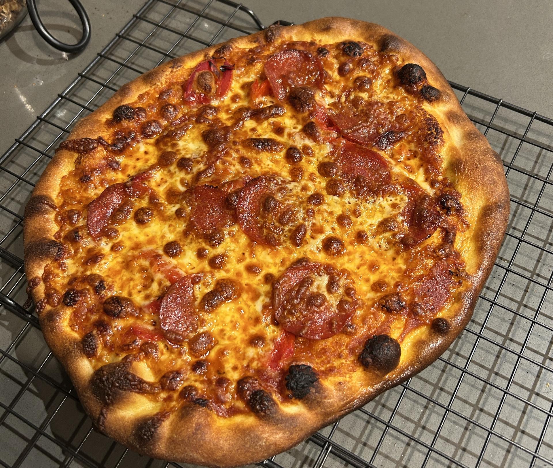 I’ll go first. My wife bought me several packages of dough mixes from the bake-at-home pizza supply company Urban Slicer, including a Neapolitan-style mix. With snow in the forecast for last weekend, I figured it’d be an ideal time to (finally) try my hand at making my own pies. Got myself this Ooni pizza peel, a NerdChef pizza baking steel, mozzarella, sauce, pepperoni, and roasted red peppers from the market, and went to work.