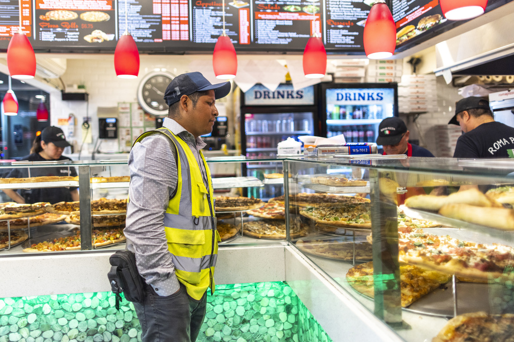 Sergio Solano waits for his dinner at a pizza shop at the end of his work day, June 21, 2024, in New York. (AP Photo/Eduardo Munoz Alvarez)